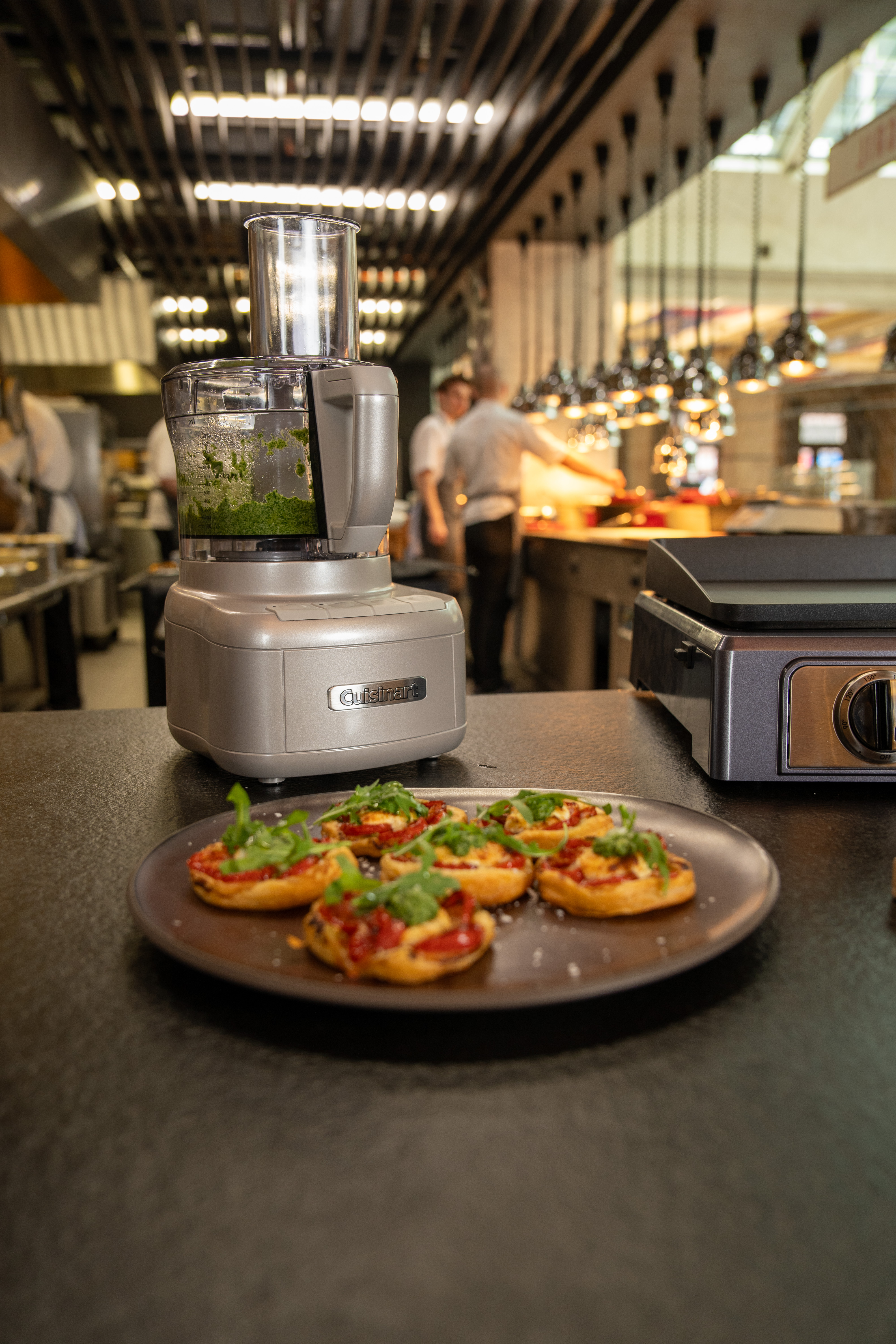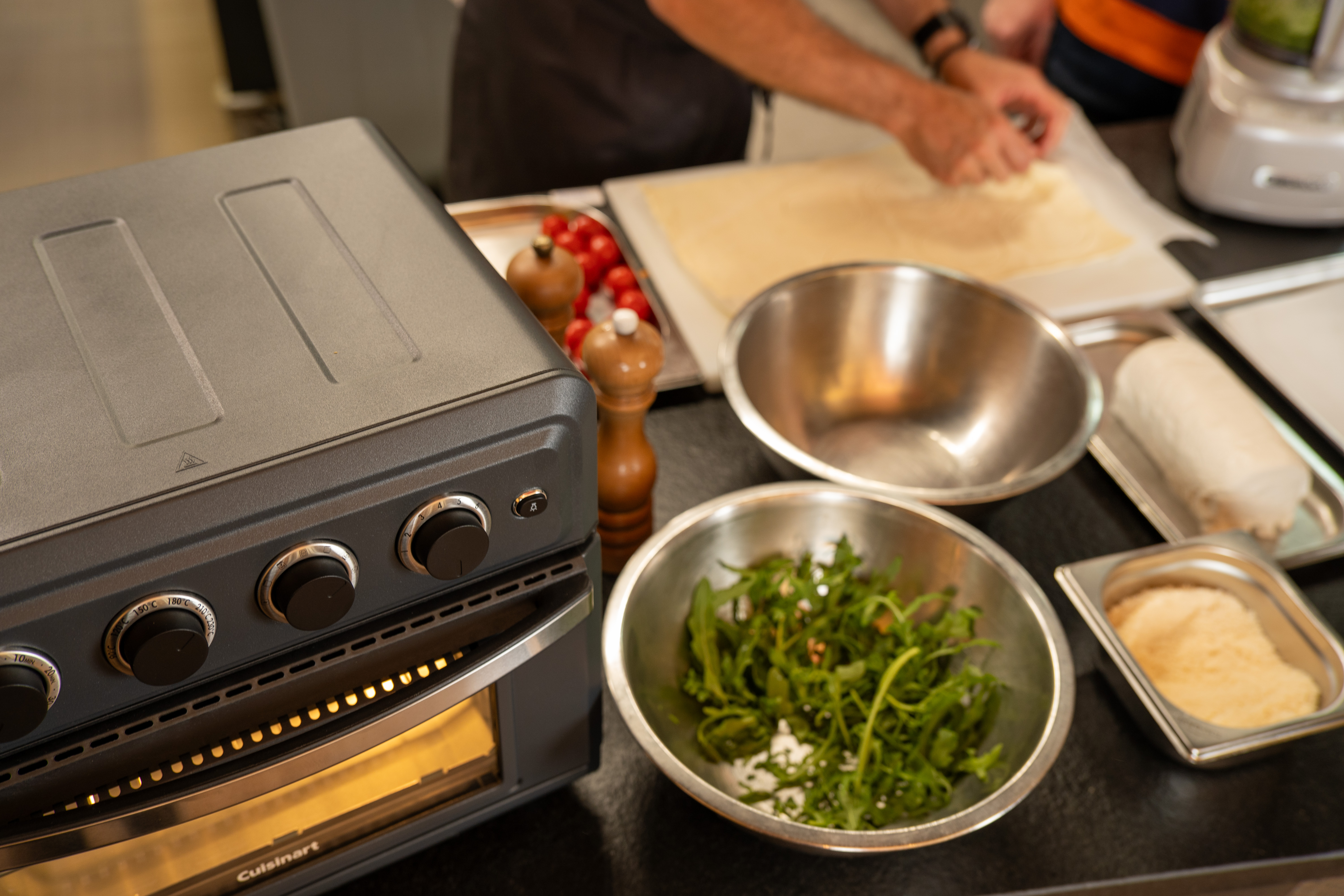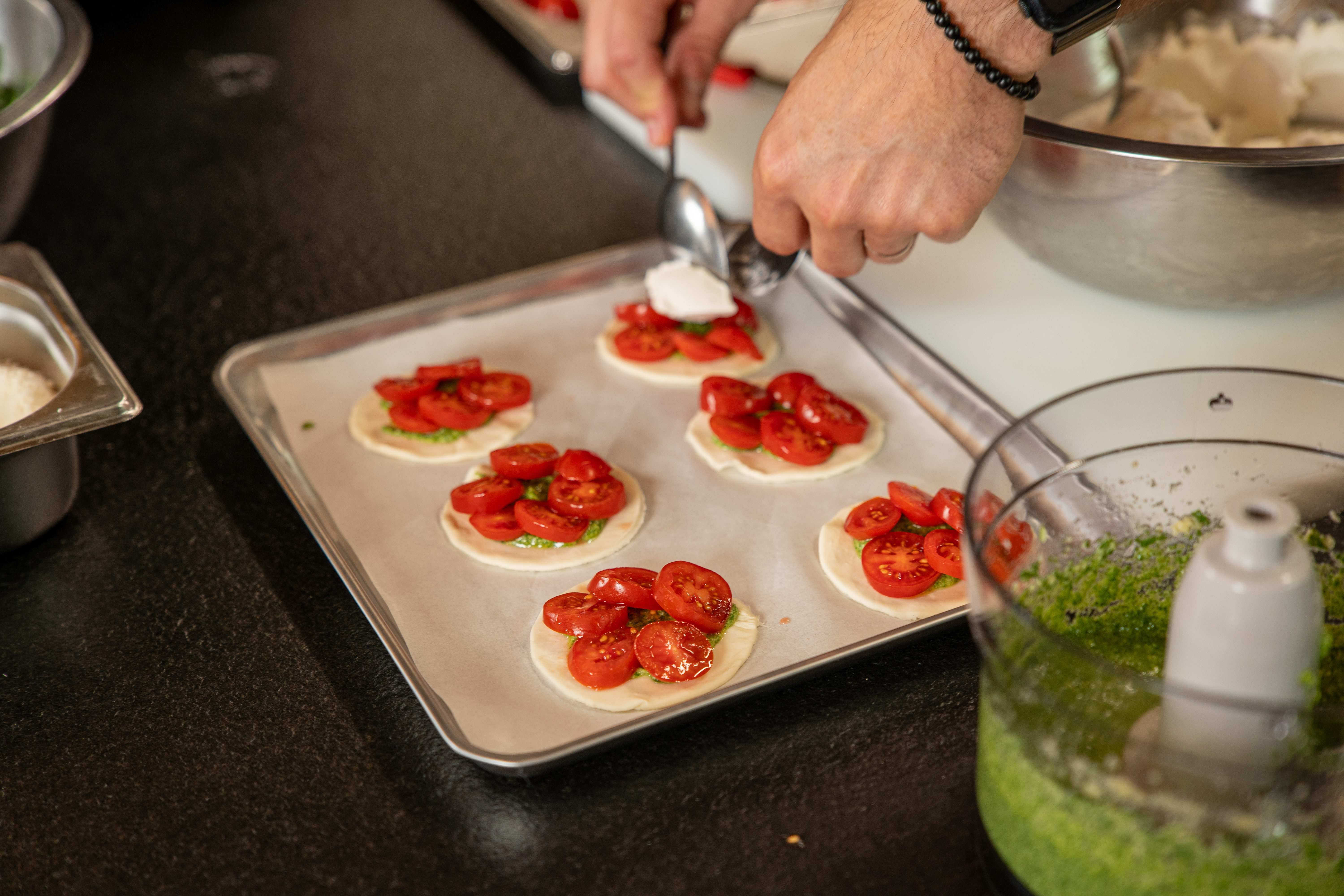 Listové těsto vykrojíme do kulatých tvarů za pomoci tvořítka nebo skleničky. Potřeme rukolovým pestem a do kruhu vyskládáme přepůlené cherry rajčata. Na rajčata poklademe kozí sýr za pomoci dvou lžiček. Pečeme v troubě, model TOA60E na 200°C cca 15minut nebo do zlatova.